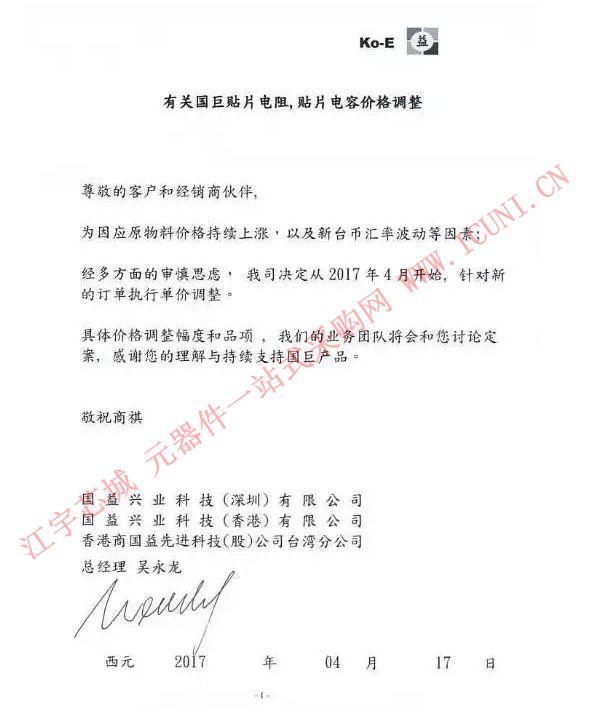 國巨決定從2017年4月開始,針對新的訂單執(zhí)行單價調(diào)整,具體價格調(diào)整幅度和品項(xiàng),將由業(yè)務(wù)團(tuán)隊和各代理商討論定案。